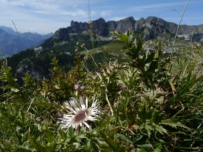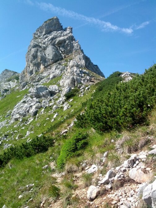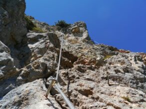 Abstieg: Vom Gipfelkreuz folgen wir in südwestlicher Richtung dem deutlich sichtbaren Weg und steigen auf diesem ab, einige Griffe erleichtern auf einer Länge von ca. 15 Metern den Abstieg über eine glatte Platte. Alternativ kann man auch über den neu eingerichteten Klettersteig (hier wieder Klettersteigausrüstung erforderlich) absteigen. Dieser beginnt etwas weiter vorn bei einem deutlich sichtbaren Drahtseil (Schwierigkeit: B). Kurze Zeit später vereinigen sich beide Wege wieder.