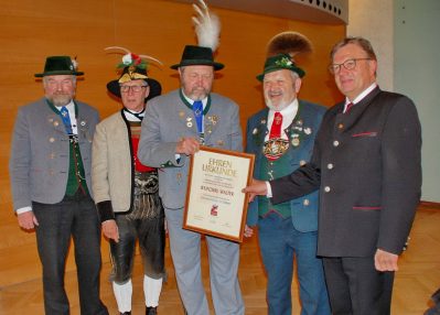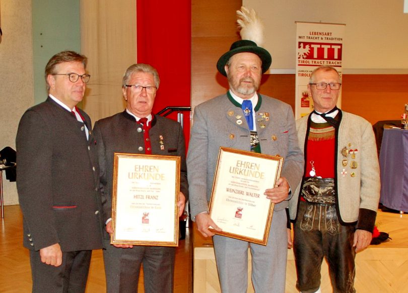 Für seine Bemühungen um die trachtlerische tirolisch-bayrische Freundschaft wurde er bei der heurigen Jahrestagung des Tiroler Landestrachtenverbandes von Landeshauptmann Günther Platter und dem Vorsitzenden Oswald Gredler mit dem Silbernen Ehrenzeichen ausgezeichnet. Der ob dieser Auszeichnung “stolze Walter Weinzierl”, so der Geehrte in seiner Dankesrede, verwies auf seine aus der Kindheit her bestehende Verbindung und Liebe zum Tiroler Land und der Stadt Innsbruck, durfte er ja acht Sommer lang in seiner Kinder- und Jugendzeit im Stadtteil Hungerburg im Kinderheim seine Ferien verbringen.