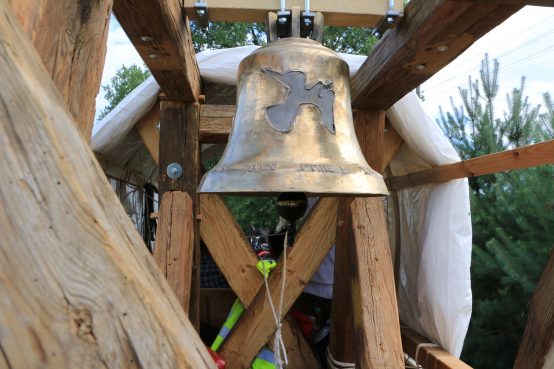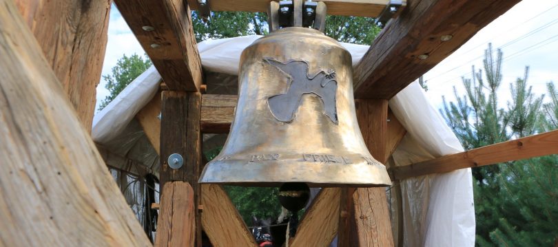 Vor dem Regen hatte ich mich unter die Friedensglocke zurückgezogen, betrachtete das gute Stück und sinnierte über den Sinn unserer Mission. Diesmal ist die Bronze eine Glocke und nicht eine Kanone!