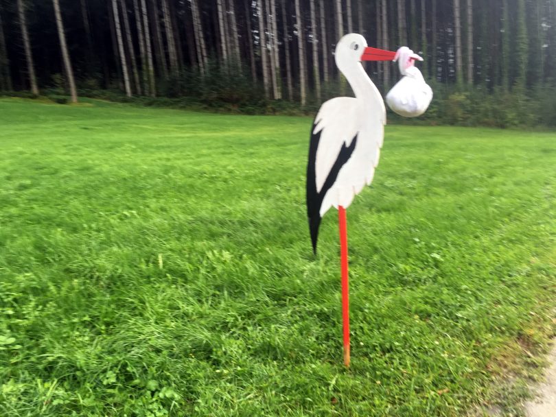 Foto: Hötzelsperger – Ein Storch in Prien-Atzing nahe der Wohnung der stolzen Eltern weist auf die Geburt des ersten Kindes und auf Tobias Martin hin.