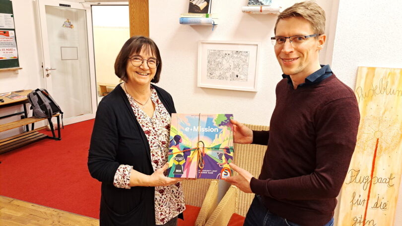 Bei der offiziellen Übergabe trafen sich Anita Moka vom Spieleteam und Sebastian Noichl vom Arbeitskreis Erneuerbare Energien (siehe Foto). Der Arbeitskreis Erneuerbare Energien wurde 1996 gegründet und freut sich, mit dieser Aktion einen wertvollen Beitrag zur lokalen Bildungsarbeit zu leisten und das Bewusstsein für nachhaltige Zukunftsgestaltung auch nach 30 Jahren noch weiter zu stärken. Das Spieleteam empfiehlt „eMission“ als anspruchsvolleres, aber äußerst fesselndes Spiel, das vor allem durch seine Nähe zur Realität begeistert. Ziel ist es, kooperativ dafür zu sorgen, dass in sechs Runden weniger CO₂ ausgestoßen wird, als Wälder und Ozeane aufnehmen können. Unterschiedliche Ausgangsbedingungen sorgen dabei für wechselnde Herausforderungen und einen hohen Wiederspielreiz. Das Thema ist hochaktuell, der Kartenmechanismus eingängig und die Umsetzung bemerkenswert realitätsnah.