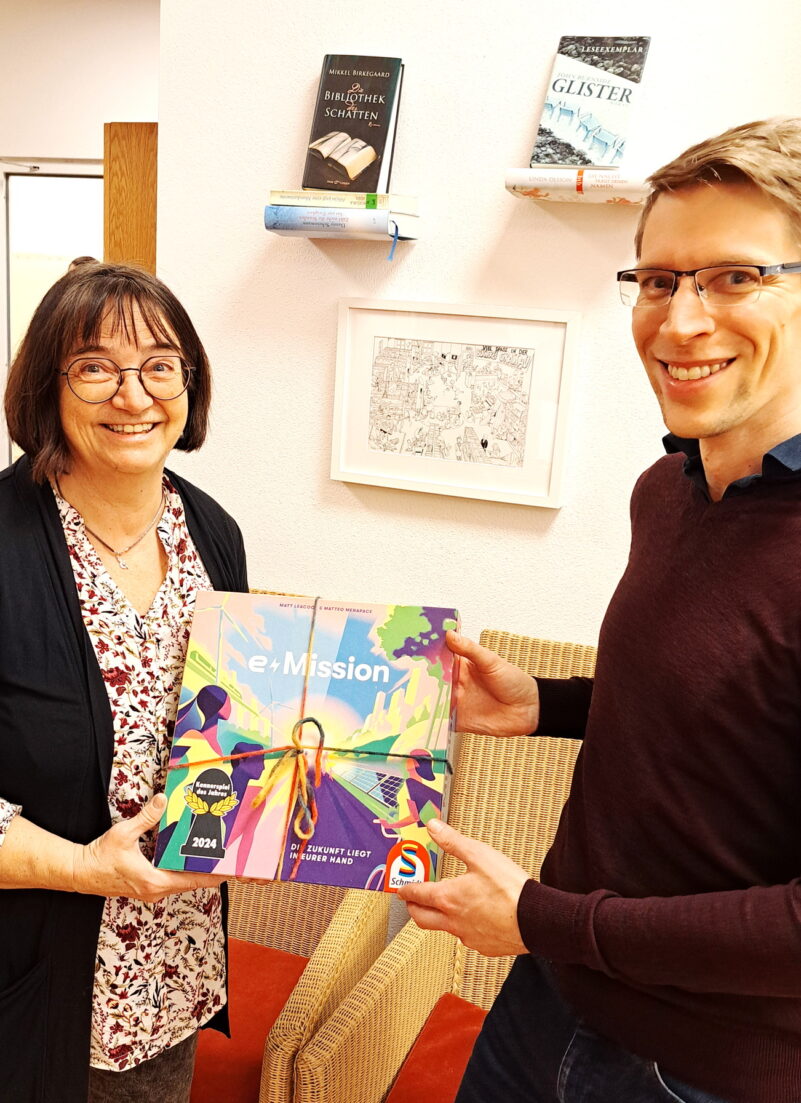 Mit der Spende erweitert die Bücherei ihr Angebot an Umwelt‑ und Bildungsspielen. „eMission“ steht in Kürze zur Ausleihe bereit und lädt Familien, Jugendgruppen und Spielebegeisterte ein, die Herausforderungen der Energiewende spielerisch zu erleben.