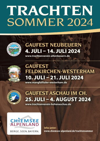 Der heurige Trachtensommer beginnt beim Bayerischen Inngau, dessen Gaufest-Gastgeber der Trachtenverein „Immergrün“ Altenbeuern vom 11. Juli bis 21. Juli ist. Der Gaufestsonntag ist am 14. Juli mit Gottesdienst um 10 Uhr und mit dem Festzug um 14 Uhr. Der GTEV „D´Mangfalltaler“ Westerham ist dann eine Woche später am Sonntag, 21. Juli Ausrichter des Gaufestes vom Gauverband I mit dem Gottesdienst um 10 Uhr und mit dem sich daran anschließenden Festzug. Die Festwoche dauert bis Sonntag, 28. Juli und endet mit dem Gaupreisplatteln. An diesem Sonntag, 28. Juli lädt der Chiemgau-Alpenverband zum Gaufest beim Trachtenverein „D´Griabinga“ Hohenaschau ein, dort sind um 10 Uhr der Feldgottesdienst und um 14 Uhr der Festzug. Die Festwoche selbst beginnt in Hohenaschau am Donnerstag, 25. Juli mit dem Bieranstich und endet am Montag, 5. August mit einem Tag der Betriebe beim Kesselfleischessen.