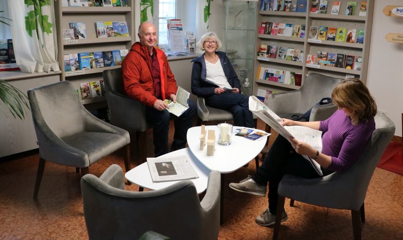 Bildunterschrift: Urlaubsgäste erfreuen sich an der gemütlichen Atmosphäre im Tourismusbüro Prien.