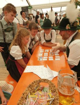 Stark vertreten waren diverse Handarbeiten wie Federkielstickerei, Gold- und Farbstickerei, Teppich-Handweberei, Faltkunst mit Papier, Harfenbau, Hirschhornschnitzerei, Spanschachteln bemalen, Hand-Stoffdruck, Töpferei, Kerzenkunst, Korbflechterei, Zirbenholzprodukte, Möbelrestauration oder Rostdeko für Haus-und Garten. Stände mit Handwerkskunst, die heute nur noch von wenigen ausgeübt wird, fanden bei den Besuchern großes Interesse. Ein Schumacher zeigte, wie man Schuhe von Hand anfertigt, eine Hutmacherin, wie bis zu 140 Jahre alte Priener Hüte restauriert werden oder wie Trachtenbeutel händisch genäht und bestickt werden, eine Bortenmacherin führte das Brettchenweben vor und hatte dafür ihren Webstuhl und viele Muster mitgebracht. Groß war der Andrang auch bei einem Stand, wo Kindern und Erwachsenen unentgeltlich Flechtfrisuren gezaubert wurden. Vom Bezirk Oberbayern war das Zentrum für Volksmusik, Literatur und Popularmusik mit einem Stand vertreten. Volksmusikpfleger Leo Meixner beantwortete die vielen Fragen der Besucher und lud am Sonntag zur Mittagszeit im Marktzelt zu einer öffentlichen Singstunde ein. Am Stand des Fördervereins für Baierische Sprache und Dialekte konnte man seine Bairisch-Kenntnisse testen, am Stand des Sachgebiets „Mundart-Brauchtum-Laienspiel“ des Gauverbandes I bei einem Fragespiel mit Glücksrad und einem Monopoly-Brauchtumsspiel mitmachen. Kleine Gewinne belohnten die richtigen Antworten oder Begriffe. Auch das Schafkopfspielen konnte erlernt werden.