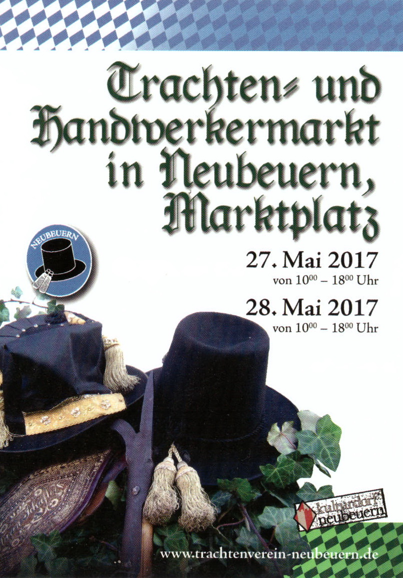 Der diesjährige Trachten- und Handwerkermarkt findet bereits am 27. & 28. Mai 2017 statt. An den über 90 Ständen findet man wie gewohnt alles was die traditions- und modebewussten Besucher zum perfekten Dirndlgwand oder zum stilechten Trachtengwand benötigen. Jeder der Aussteller ist Fachmann und Künstler auf seinem Gebiet und kann die Besucher bei allen Fragen um seine Waren umfassend beraten.