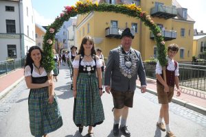 Strahlendes Königsschützenpaar unter dem blumengeschmücktem Bogen beim Dorfener Trachten- und Schützenumzug