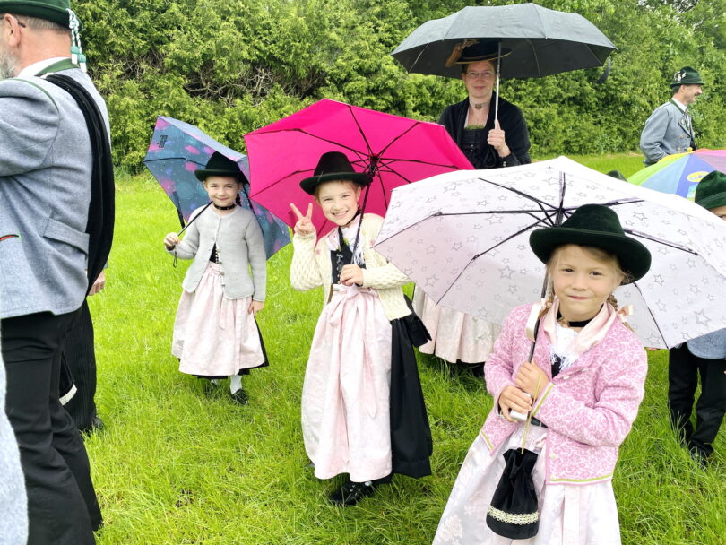 Leider machte den Pittenhartern das Wetter ziemlich zu schaffen und so mussten wir die Kirche im Zelt abhalten. Das machte der Feier aber keinen Abbruch. Zum Festzug strömten dann alle Trachtler nach draußen und zogen mit wehenden Fahnen, zünftiger Blasmusik und festlichen Wägen durch den Ort. So ein „Trachtler-Herz“ schlägt eben auch bei Regen hoch.