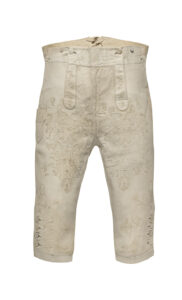 Das Prunkstück der Ausstellung – eine weiße Lederhose mit filigraner Stickerei. Sie wurde 1810 gefertigt! Bildquelle: Bezirk Oberbayern, Zentrum für Trachtengewand