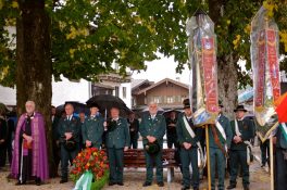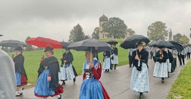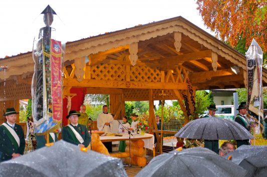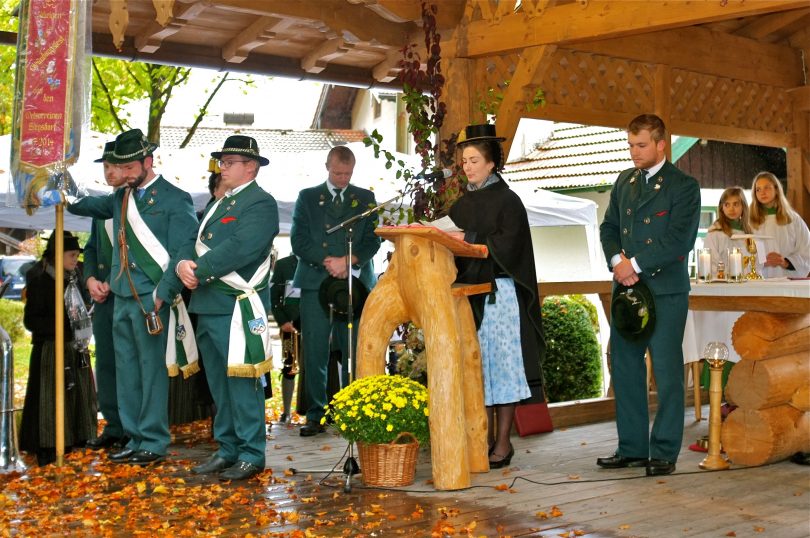 „Schön Nass ist auch Schön“ begrüßte Bruder Joachim aus dem Kloster Maria Eck augenzwinkernd die Mitglieder der Trachtenvereine Heutau und Siegsdorf nach einem kurzen aber nassen Kirchenzug, den die Musikkapelle Vogling-Siegsdorf und die beiden Vereinsfahnen angeführt hatten. Knapp 150 Frauen und Männer, Dirndl und Buam der Trachtenvereine Heutau und Siegsdorf, hatten sich sich trotz Kälte und Dauerregen zum Jahrtags-Gottesdienst vor dem Freialtar im Siegsdorfer Kurpark eingefunden. Die „Heutauer“ als Ausrichter des heurigen Jahrtages hatten sich viel Mühe gegeben den Pavillon festlich zu schmücken und der Witterung entsprechend für die feierliche Messe, die von der Musikkapelle (bestens geschützt unter einem Zelt) mit der Schubert-Messe umrahmt wurde, vorzubereiten. Bruder Joachim stellte die Messe und den Jahrtag unter das Thema „Verbundenheit“. „Eure Tracht verbindet Euch alle in eurem Tun und Leben, aber auch mit allen die vor Euch waren und mit allen die noch nach Euch ihr Leben in den Dienst von Glauben und Heimattreue stellen“, lobte der Priester die Trachtlerinnen und Trachtler. Lesung und Fürbitten wurden von Mitgliedern des GTEV Heutau vorgetragen. Gemeinsam marschierte man dann wieder zurück zum Kriegerdenkmal am Kirchplatz, wo der Vorstand des GTEV Heutau Christian Landler an die vielen Generationen von Trachtlerinnen und Trachtlern erinnerte, die den Weg zur heutigen Blüte der beiden Brudervereine auch in schwierigen Zeiten geebnet hatten. „Fast ist unser Vereinsleben „Dank Corona“ wieder so heruntergefahren wie in den Zeiten des großen Krieges“, bedauerte Landler und hoffte gleichzeitig auf das nötige Durchhaltevermögen der Mitglieder bis zu einer hoffentlich baldigen „Normalität“ im Leben und Jahresablauf der Trachtenvereine. Mit einer gemeinsamen Einkehr im Siegsdorfer Festsaal konnte der verregnete Sonntagvormittag dann trocken und wohl geborgen ausklingen.