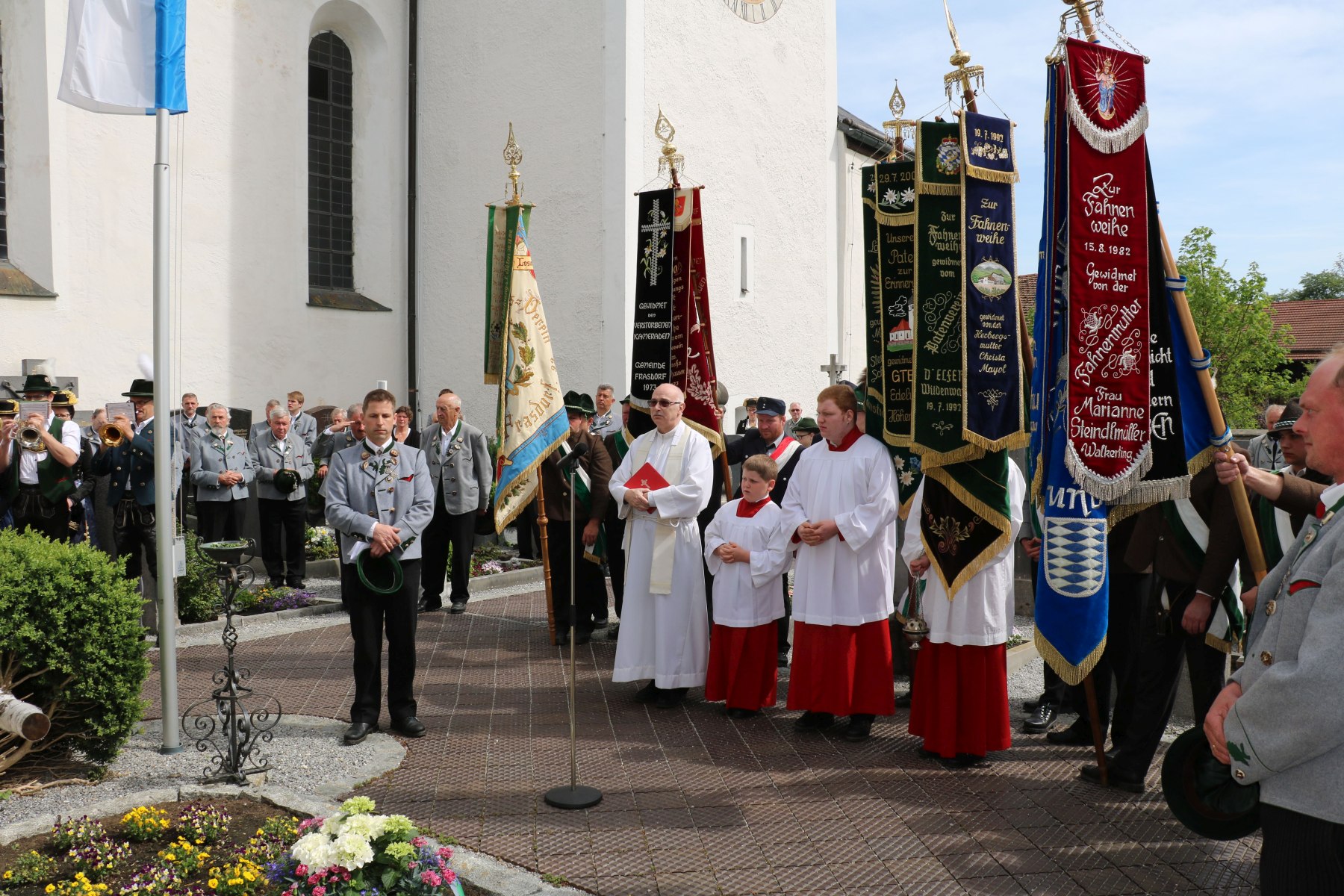 Pfarrer Hermann Overmeyer und Vorstand Sepp Enzinger gedenken beim Jahrtag des Frasdorfer Trachtenvereins der verstorbenen und gefallenen Vereinsmitglieder am Kriegerdenkmal in Frasdorf