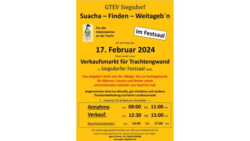 Am Samstag, den 17. Februar, lädt der Trachtenverein Siegsdorf zu einem Trachtenkleidermarkt im Siegsdorfer Festsaal ein.