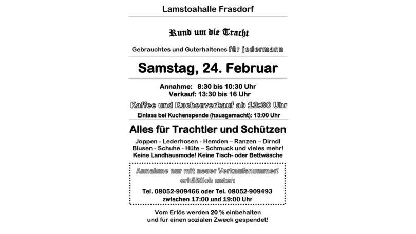 Am Samstag, den 24. Februar 2024, gibt es beim Trachtenmarkt in Frasdorf alles rund um gebrauchte Trachten zu erwerben. Die Markt findet von 13:30 bis 16:00 Uhr in der Lamstoahalle statt. Es werden Kleidungsstücke für Trachtler und Schützen von Kopf bis Fuß angeboten, sowohl für Männer, Frauen als auch für Kinder.