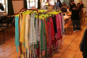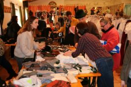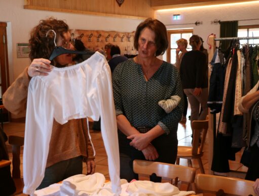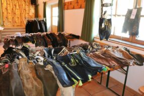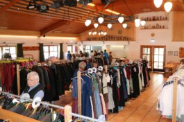 Die Auswahl war reichlich Großer Andrang herrschte an den Tischen für Kinderbekleidung mit kurzen Lederhosen zum Plattlln, Haferlschuhen, Hemden und Trachtenwesten für die Buam oder Dirndlgwand, Blusen und Schuhe für die Trachtendirndl. Für viele Mütter, die sich für etwas Gebrauchtes entschieden, war vor allem der Preis entscheidend. So ging manches gut erhalten Stück in vertretbarer preislicher Höhe über den Tresen. Für die Kenner und Liebhaber des Trachtengwands haben die Frasdorferinnen immer ein paar besondere Schmankerl bereit: so lagen in diesem Jahr mehrere Lederhosen mit ausgesuchten Hosenträgern für Männer und Buben auf den Verkaufstischen, dazu Trachtenschmuck, ein paar Münzen und Anhänger für den Charivari, ausgesucht schöne Messer und Stiletts, selbst gestrickte Trachtenstrümpfe und Loiferl und, und und …. Ein schier unerschöpfliches Angebot an Blusen, Schürzen und Dirndlkleidern mit allen Accessoires soll den Frauen und Mädchen helfen, stets passend gewandet über die Sommersaison zu kommen. Kaffee und Kuchen gab’s auch an der großen Theke mit einer ebenso großen Auswahl an selbstgebackenen Kuchen und Torten. Nach den Strapazen des Einkaufs blieb bei vielen auch noch genug Zeit für einen kleinen Ratsch.