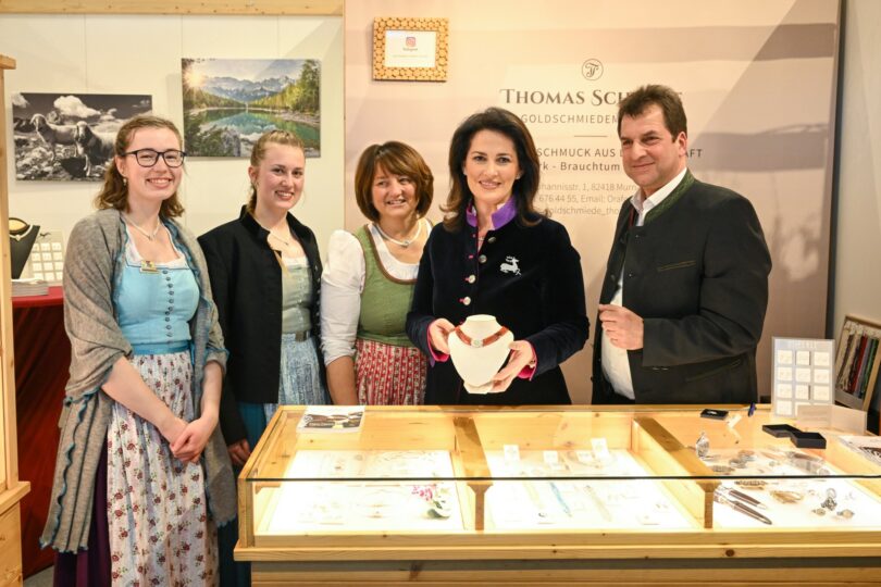 Nach zwei Jahren Coronapause präsentiert sich der Freistaat Bayern in diesem Jahr wieder auf der Internationalen Grünen Woche in Berlin als Land der Genüsse. In der großen Bayernhalle – seit vielen Jahren der Besuchermagnet schlechthin – zeigen über 50 Aussteller den Besucherinnen und Besuchern, was der Süden Deutschlands an kulinarischen Spezialitäten und als gastfreundliche Urlaubsregion zu bieten hat. Mit dabei ist auch die Region Murnau-Zugspitze, eine der touristischen Top-Regionen des Freistaats. Auf dem Stand der Zugspitzregion hat auch Agrarministerin Michaela Kaniber bei ihrem Rundgang durch die Bayernhalle vorbeigeschaut. Goldschmied Thomas Schwabe zeigte ihr den hochwertigen Trachtenschmuck aus Gold und Silber, den er auf dem Stand präsentiert.