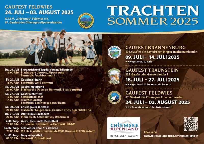 Seit dem Jahr 2017 gibt es in der Ferienregion Chiemsee-Alpenland einen sogenannten „Trachtensommer“. Zentrale Angebote dabei sind die jeweiligen Gautrachtenfeste des Bayerischen Inngau-Trachtenverbandes, des Gauverbandes I und des Chiemgau-Alpenverbandes für Tracht und Sitte. Auftakt der Feierlichkeiten ist heuer am Mittwoch, 9. Juli in Brannenburg mit dem Bieranstich. Die Gaufeste als Höhepunkte eines Trachtlerjahres sind am Sonntag, 13. Juli in Brannenburg (Inngau), am Sonntag 20. Juli in Traunstein (Gaufestgemeinschaft Traunstein) sowie am Sonntag, 27. Juli in der Feldwies (Chiemgau).