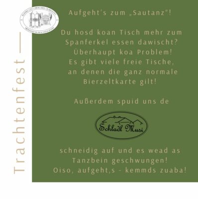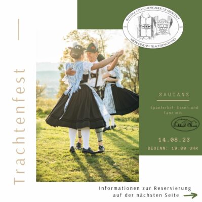 Der Montag, 14. August stellt den Schlusspunkt der Grabenstätter Festtage dar. Ab 19 Uhr wird zum Sautanz mit Spanferkelessen und Tanz eingeladen, bei der die Schladl Musi aufspielt.