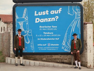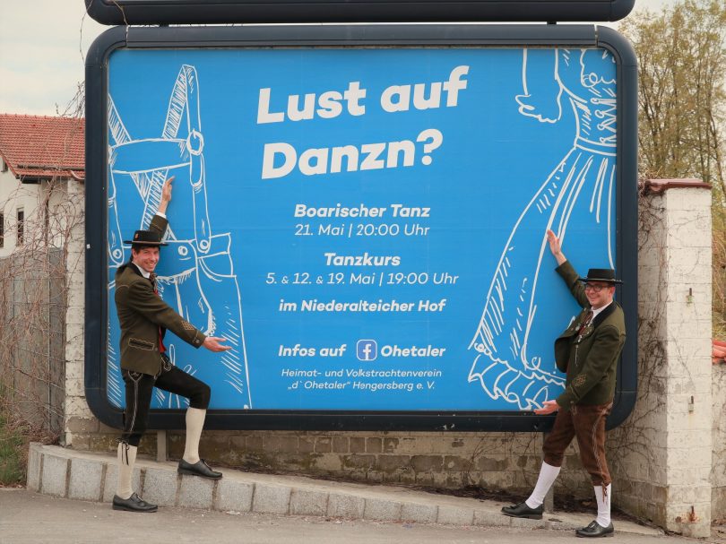 Der Heimat- und Volkstrachtenvereien d’Ohetaler Hengersberg geht neue Wege, um nach der zweijährigen Volkstanzpause wieder auf sich aufmerksam zu machen. So bewirbt der Verein seinen Boarischen Tanz und den Volkstanzkurs dazu über Großraumwerbetafeln im Ort. Laut Vorstand Martin Alfery sei diese Werbung eine großartige Möglichkeit die Menschen aus der Region wieder auf den Verein und die Möglichkeit des Tanzens aufmerksam zu machen. Schließlich wird fast jeder Hengersberger mindestens einmal an den großen Schildern vorbeifahren. Ob auf dem Weg zur Arbeit, zum Einkaufen oder einfach nur in der Freizeit – die auffälligen Schilder werden in ihrem strahlenden weiß-blau sicher viele Blicke auf sich ziehen. Für das frische Layout wurde extra mit einem Grafiker zusammengearbeitet.
