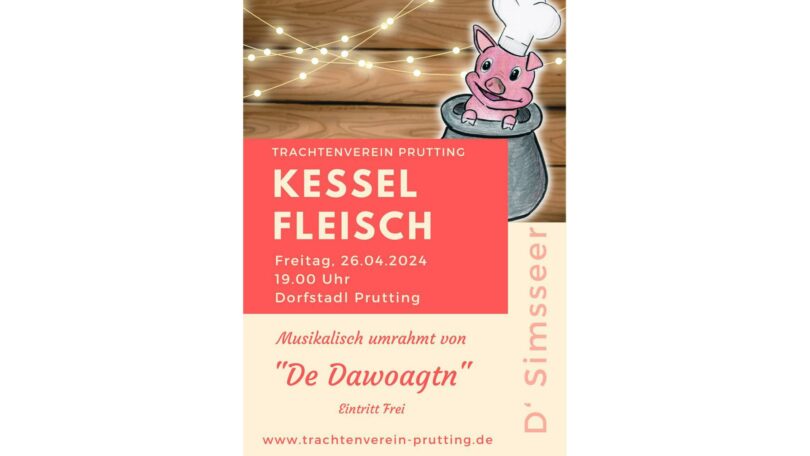 Der Trachtenverein Prutting lädt am kommenden Freitag, 26. April 2024, zu einem Kesselfleischessen im Pruttinger Dorfstadl ein. Beginn bei freiem Eintritt ist um 19 Uhr. Für die musikalische Umrahmung sorgt die Musikgruppe “De Dawoagtn”. Weitere Informationen gibt es unter www.trachtenverein-prutting.de.