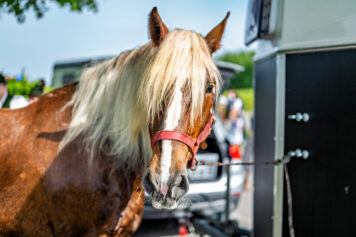 Dort wurden zwei kräftige Pferde vor den prächtigen Maibaum gespannt, bereit, ihn auf seinem Weg zum Dorfplatz zu ziehen. Die Sonne glitzerte auf ihren glänzenden Fellen, als sie mit stolzem Schritt in Bewegung setzten.