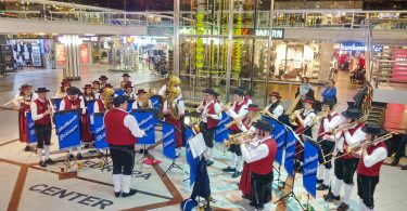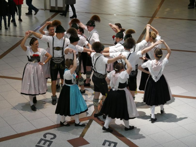 Bayerische Lebensfreude vermitteln und Berlin ein wenig kennenlernen. Unter diesem Motto stand die Einkehr im Europacenter. Doch bevor sich die Pruttinger Trachtler von den reichhaltigen Schmankerl im Lokal “Kartoffelkiste” überzeugen konnten, traten noch die Aktiven Dirndl und Buam und die Schnalzergruppe des Vereins auf. Passanten, Geschäftsinhaber und ihre Mitarbeiter zeigten großes Interesse und ließen sich sichtlich von der guten Stimmung mitreissen. Die Blicke der Reisegruppe richteten sich auf die große Uhr im Eingangsbereich. Gelbe Flüssigkeit füllt verschieden große Glasbehälter, die sich im “Laufe der Zeit” füllen und leeren.