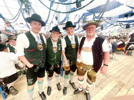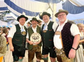 - Erinnerungsgeschenk für Bayer. Trachtenverband von links: Brian Oberheim, Toni Hö. – Joe Hubner – Bob Hugel