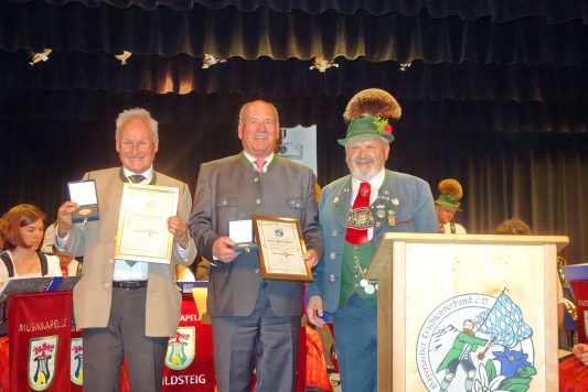 Im Rahmen einer Feierstunde im Augustinerstadl des Trachtenkulturzentrums in Holzhausen konnte sich der Bayerische Trachtenverband bei zwei Landtagsabgeordneten für deren langjährige und wertvolle Unterstützung bedanken. Die Abgeordneten Peter Winter und Erwin Huber erhielten aus der Hand von Landesvorsitzenden Max Bertl die Lehrer-Vogl-Plakette überreicht. Damit wurde zum Ausdruck gebracht, dass die beiden Abgeordneten bei der Verwirklichung des Trachtenkulturzentrums und darüber hinaus bei Anliegen des Bayerischen Trachtenverbandes stets ein offenes Ohr hatten und als Verbindungspersonen zur Bayerischen Staatsregierung wichtige Brücken bauten.