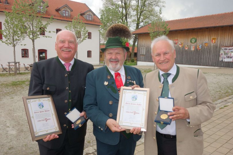 Foto/s: Hötzelsperger – Ehrung mit der Lehrer-Vogl-Plakette: von links: MdL Peter Winter, Landesvorsitzender Max Bertl und MdL Erwin Huber (im Innenhof des Trachtenkulturzent