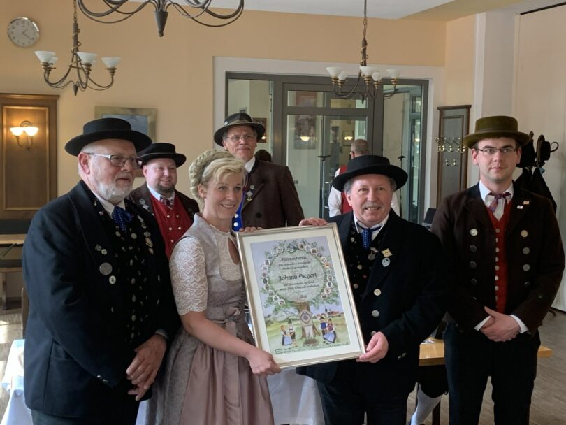 Bericht und Foto: Dominik Beer – Veronika Söllner überreichte Johann Siegert (2. v. re) die Urkunde und Ehrennadel der Bayerischen Trachtenjugend in Gold