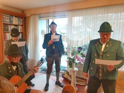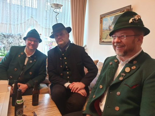 Vorstand Florian Hähle ließ es sich am 90. Geburtstag von Erich Hagner nicht nehmen, diesen mit einer kleinen Abordnung und einigen Vereinsmusikanten zu überraschen. Einem Ständchen vor dem Haus folgte noch ein gemütliches Beisammensein in der Wohnung, dabei dankte Hähle dem Jubilar für seine akkurate und immense Arbeit zum Wohle der Chiemgauer-München. Als Geschenk gab es neben einem Korb kulinarischer Köstlichkeiten einen Riesen-Neunziger aus geflochtenem Brezenteig sowie einen Ehrentanz mit Vereinsmitglied Regina Wallner aus Prien a. Chiemsee. Mit dabei war auch Chiemgaus Standartenträger Christian Härtl, der ebenfalls Münchner Vereinsmitglied ist.