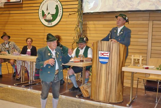 Ganze 77 Jahre lang füllte der Jubilar –zum Teil zwei Ämter parallel – ein Ehrenamt aus, nur vier Jahre waren beruflich bedingt eine Pause. Erich Hagner war der erste Jugendleiter des Vereins, er war dies 11 Jahre lang von 1970 bis 1980 bevor er das Amt an seinen Sohn Christian weitergab. Dazu erinnert er sich: „1975 war der erste Gaujugendtag des Chiemgau-Alpenverbandes mit dem damaligen Gaujugendwart Toni Fleindl in Reit im Winkl, da waren wir unter anderem mit meinen Kindern und mit dem Zwoasteyerer vertreten“. Ein weiteres wichtiges Amt für den Münchner Trachtenverein, der seit seiner Gründung ein enges Verhältnis mit dem Chiemgau pflegte, weil es Chiemgauer waren, die arbeitssuchend in die Stadt gingen, war das Amt des Zeugwarts. Wichtig deswegen, weil alle Vereins-Unterlagen und Wertgegenstände wie gewonnene Preise privat verwaltet wurden. „Diese Aufgabe habe ich von meinen Eltern übernommen, auch meine leider schon verstorbene Frau Elisabeth (sie war auch Fahnenmutter) hat sich einige Jahre dafür zur Verfügung gestellt, so dass unsere Familie rund 45 Jahre das Amt des Zeugwarts innehatte“ – so Hagner, der auch 25 Jahre Erster Revisor und in dieser Funktion auch Mitglied der Vorstandschaft war. Weitere Tätigkeiten waren nach Ende des Zweiten Weltkriegs mit Wiederaufnahme der Vereinsaktivitäten die Verantwortung als Zweiter und dann als Erster Vorplattler. 1989 erklärte er sich bereit, das Amt des Ersten Vorstands zu übernehmen. In seiner achtjährigen Vorstandsperiode fiel auch die Ausrichtung des 100jährigen Vereins-Jubiläums, hierzu erinnert er sich besonders gerne wie folgt: „Das war für unseren Trachtenverein in der großen Stadt eine hohe Herausforderung, dank der Unterstützung der Stadtverwaltung und des Chiemgau-Alpenverbandes wurde es zu einem besonderen Erlebnis“. Sein Nachfolger als Erster Vorstand wurde dann Herbert Jackstieß. Und dessen Nachfolger Florian Hähle war es dann, der im Jahr 2019 die 125-Jahr-Feier mit großer Chiemgauer Beteiligung in München organisierte und durchführte – mit Unterstützung von Erich Hagner.