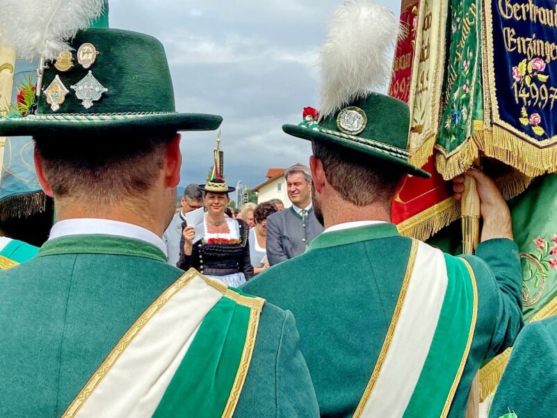 Die christliche Heimatliebe machte sich auch bemerkbar bei der Begrüßung durch Gauvorstand Michael Hauser sowie bei den Grußworten von Bayerns Ministerpräsident Dr. Markus Söder („Ehrenamt braucht Freiheit“) und Landrat Bernhard Kern vom Berchtesgadener Land („Respekt vor Festleiter Hans Hogger und seinen Teisendorfern!“). Und natürlich auch nach dem Gottesdienst beim Festzug und beim gemeinsamen Beisammensein im Festzelt.  Über 8.000 Trachtler aus 117 Vereinen, Musikanten von 40 Kapellen, Fahnenabordnungen, Festwägen und Ortsvereinen nahmen Anteil an der Gemeinschaftsfreude.