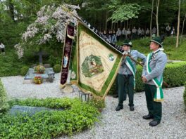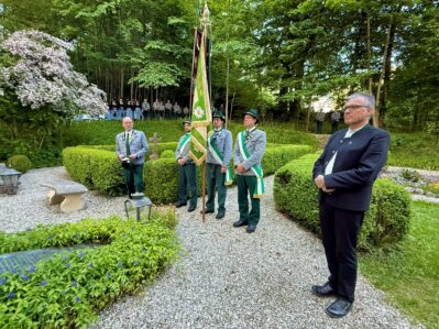 Im Anschluss daran versammelten sich die Griabinga-Trachtler am Familienfriedhof der Freiherrn von Cramer-Klett auf dem Schlossberg zum traditionellen Totengedenken. Erster Fähnrich Lorenz Hofmann senkte die Vereinsfahne zum Gruß und stillen Andenken an die freiherrliche Familie von Cramer-Klett – langjährige Förderer der Trachtensache und Protektoren des Chiemgau-Alpenverbands – sowie an die verstorbenen Vereinsmitglieder. Erster Vorstand Claus Reiter erinnerte an jene Mitglieder, die im vergangenen Jahr verstorben sind. Namentlich gedachte er ihrer und betonte, wie wichtig es sei, das überlieferte Erbe von Tracht und Brauchtum mit Kraft und Mut weiterzugeben.