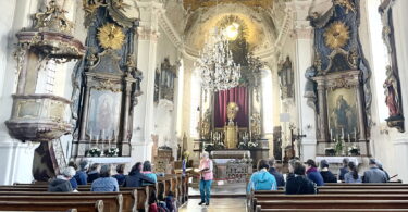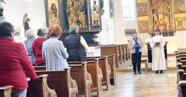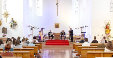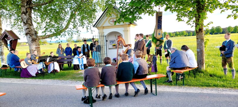 Von der Linderer Kirche ging es mit einem Bittgang zum „Dom“, der Bildstock zwischen Linden und Lochen. Bitten um den Frieden in der Welt und individuelle Themen die jeder selbst mit sich trägt wurden der Mutter Gottes vorgetragen. Die Andacht, die Pfarrer Thomas Neuberger mit den Trachtlern feierte, war von wunderschönen klängen den „Bernad Gschwister“ und der „Erlacher Gittarenmusi“ umrahmt. Sepp Pallauf aus Lochen bekam von der Vorstandschaft Martin Eichner und Anne Jaud eine aktuelle Gauchronik überreicht, für jahrzehntelanges fotografieren und filmen der Vereinsveranstaltungen. Schlagfertig hielt er diese Ehrung gleich selbst fotographisch fest.Nach einem gemeinsamen „Segne du Maria!“ ging es zurück nach Linden zum „Huber in Linden“, um dort den Abend gemütlich mit Musik ausklingen zu lassen.