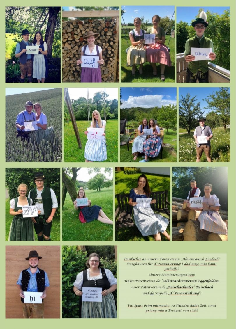 Schau auf mi, schau auf di – hoid ma zamm, dann griang mas hi! – Mit diesen Worten muntern sich unsere Vereine gegenseitig auf und zeigen so den guten Zusammenhalt unter den Trachtlerinnen und Trachtlern. Vereins- und gauübergreifend nominieren sie sich gegenseitig um mitzumachen. Mitmachen um pro Person, gekleidet im boarischen Gwand ein Schild in die Höhe zu halten, auf dem jeweils ein Wort der Challenge geschrieben steht. Ein Bild von jedem Teilnehmer, diese aneinander gereiht und so entstehen derzeit wunderschöne Collagen, die via Instagram auf die Reise gehen.