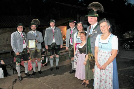 Diese traditionsreiche Partnerschaft besiegelten die beiden Vorsitzenden, Sebastian Gasteiger von den „D´Jenbachtalern“ und Peter Hagnberger von den „d´Auerberger-Hocheck“ als künftige „Patenschaft“. Ein großes Aufgebot an Trachtlern aus beiden Vereinen traf sich zu einer gebührenden Feier mit bestätigter Urkunde im großen Biergarten des 903 üNN gelegenen Bergasthofs „Hocheck“ am Auerberg in der Gemeinde Fischbachau. Vom patenbittenden Verein wohnten Ehrenvorsitzender Sebastian Gasteiger (Lerl-Wast), sämtliche Ehrenmitglieder, sowie Vereinsmitglieder und die „Aktiven Plattler“ bei. Auch von der Auerberger Seite fand sich eine große Anzahl an Mitgliedern zur Gründung der Patenschaft ein. Sie hatten neben den schmucken „Aktiven“ auch ihre Kinder- und Jugendgruppe mitgebracht, die mit bodenständigen Tänzen und Plattlern den Abend ihre Aufwartung machten. Musikalischer Begleiter war das Quintett der „Auerberger Tanzlmusi“, welches für einen würdevollen Empfang der einmarschierenden Bad Feilnbacher Gäste sorgte.