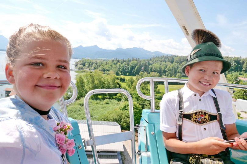 Nach dem emotionalen Höhepunkt, als die Kinder Luzia Huber (GTEV Prien) und Lukas Huber (GTEV Atzing) namens des Bayerischen Trachtenverbandes und des Chiemgau-Alpenverbandes die Bundeskanzlerin Angela Merkel bei ihrer Ankunft am Schiff „Ludwig Feßler“ im Hafen von Prien-Stock begrüßen durften kam es kurz danach zu einem zweiten, diesmal messbaren Höhepunkt. Da derzeit – und wie Michael Feßler von der Chiemsee-Schifffahrt inzwischen mitteilte – noch bis zum 15. September ein 38 Meter hohes Riesenrad direkt am Chiemsee-Ufer steht, war es naheliegend, dass die Trachtenverantwortlichen die Kinder noch zu einer Partie Riesenrad einluden. „Einfach bärig, richtig schön!“ – das waren die Antworten der jungen Trachtler auf die Frage, wie es war, als sie den Chiemsee, die Berge sowie Prien mit seinem Hinterland von einer ganz besonderen Perspektive sahen.