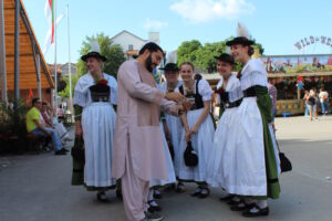 Die jungen Hohenfurcher Trachtlerinnen machen beim Trachtenfest in Landsberg Selfies mit einem Mann im indischen Siri.