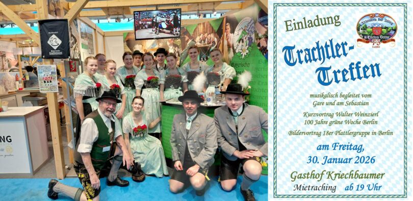 An diesem Abend wird Walter Weinzierl, Ehrenkassier des Bayerischen Trachtenverbandes und Ehrenvorsitzender vom Bayerischen Inngau-Trachtenverbandes über seine bisherigen und aktuellen Erfahrungen in der Bayernhalle auf der Grünen Woche in Berlin berichten. Ausserdem gibt es einen Bildervortrag zum Thema “18er Plattlergruppe in Berlin”.