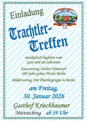 Die 18 Trachtenvereine im Altlandkreis Bad Aibling laden für Freitag, 30. Januar zu einem Trachtler-Treffen mit Musik ein. Beginn ist um 19 Uhr im Gasthof Kriechbaumer in Mietraching.
