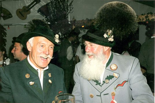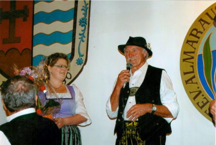 Volksmusik und Singen von Kindesbeinen an – Mit dem Trachtenheim gab es verschiedene Impulse und neue Veranstaltungsmöglichkeiten. Unter anderem rief Jakob Irrgang, der nach Miche Berneder Zweiter Vorstand wurde, Tanzkurse für Jugendliche und einen Volkmusik-Hoagascht ins Leben. Und die Volksmusik war für Miche Berneder von Kindheit an etwas Schönes, dazu erinnert er sich gerne: „Schon als kleiner Bua habe ich Radio-Lieder nachgesungen, nach dem Trachtenheimbau traten Sepp und Hans Steinbichler und ich mit Zitherbegleitung durch Willi Weitzel sechs Jahre als Hittenkirchener Sänger auf. Alsdann erlernte ich das Gitarrenspielen und das Balladensingen, rund 15 Jahre pflegte ich mit Angela Grannetsberger aus Übersee (und nach ihrer Heirat aus Antholling) sowie auch mit Georg Seifritzberger aus Traunstein einen Zwoagesang“. Zehn Jahre organisierte Miche Berneder die stets ausverkauften Hoagascht mit bekannten und regionalen Volksmusikgruppen. Weitere Gesangs-Aktivitäten waren die 27jährige Zugehörigkeit zum Männerchor Grabenstätt und die Gründung eines vierstimmigen Gesangs aus den Reihen des Chores. „Auftritte sind zwar schön, aber nicht entscheidend, wir treffen uns wenn´s geht jede Woche zur eigenen Freude so wie wir es viele Jahre bei den Musikanten-Stammtischen gewohnt waren“ – so Miche Berneder, der sich mit Gitarre und Kontrabaß auch noch mit Musikfreunden aus Eggstätt und Trostberg zusammentut. Seit seiner Pensionierung als Immobilienmakler und nach überstandener Krankheit hört sich der rege Volksmusikant die entsprechenden Radio-Sender an und spielt bei ihm bekannten Stückln für sich in der guten Stube mit. Oder er spielt die Stückln nach, die er mit seinen Volksmusikfreunden in den letzten Jahrzehnten auf CD aufgenommen hat.