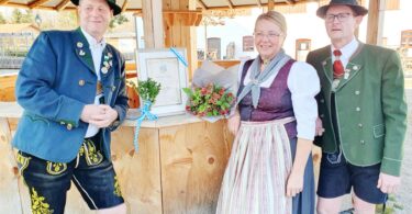 Im Anschluss wurde traditionell die Gaustandarte übergeben, die zu besonderen Anlässen getragen wird. Die Illachtaler Rottenbuch, die auch die Messe sehr schön musikalisch gestaltet und vorbereitet hatten, überreichten sie an den Trachtenverein Schloßbergler Schongau. Den ersten Einsatz hat die neue Fahnenabordnung bereits am kommenden Wochenende beim Huosigaufest in Geltendorf.