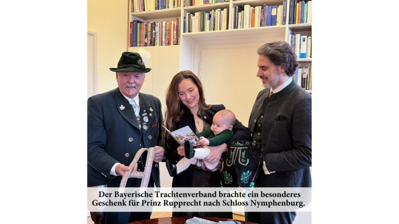 Prinz Rupprecht, Sohn von Prinz Ludwig und Prinzessin Sophie, erhielt als „Weisert“ eine Lederhose vom Bayerischen Trachtenverband. Der „Weisert“ ist eine alpenländische Tradition, bei der zur Geburt eines Kindes Brot oder Hefegebäck verschenkt wird. Der kleine Rupprecht wird die Vorteile dieses praktischen Kleidungsstücks wohl erst später zu schätzen wissen.