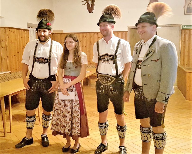 Foto: Johanna Fischbacher – Vorplattler Sebastian Schuster (links) freute sich Theresa Stephan persönlich von Jugendleiter Hans Kaiser in der Aktivengruppe aufnehmen zu können. Der neue Erste Vorstand Anton Strahlhuber (rechts) und Jugendleiter Hans Kaiser freuen sich mit.
