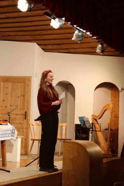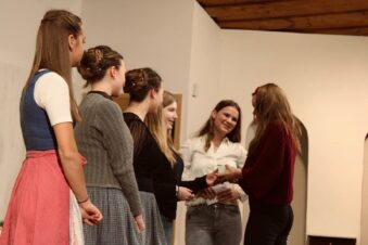 Im Anschluss folgte noch ein Auftritt der Dochstuimusi, ehe sich Ansagerin Johanna Wörndl bei allen Mitwirkenden, dem übrigen Jugendleiterteam sowie allen weiteren Helfern bedankte. Im Rahmen der Weihnachtsfeier wurde Johanna Wörndl außerdem offiziell in das Jugendleiterteam aufgenommen. Als symbolisches Zeichen überreichten ihr die Dirndl aus der Dirndlgruppe 4 einen Schlüssel fürs Trachtenheim.