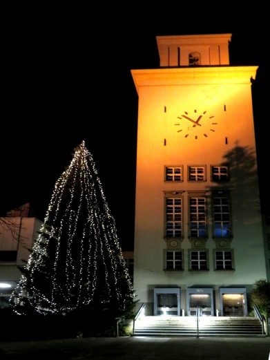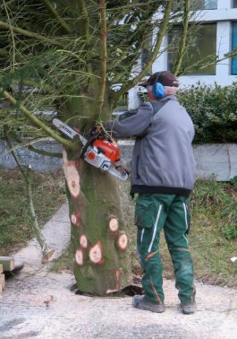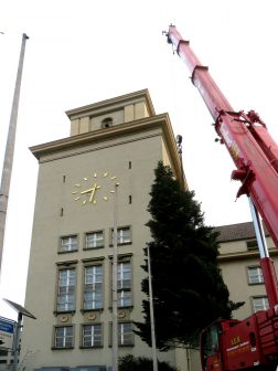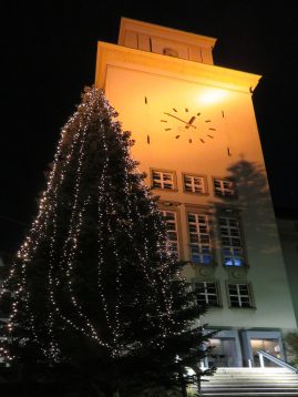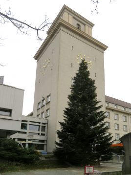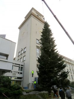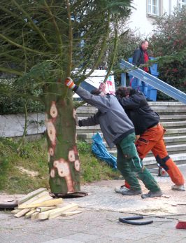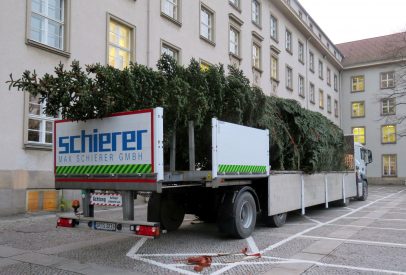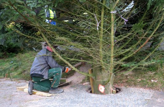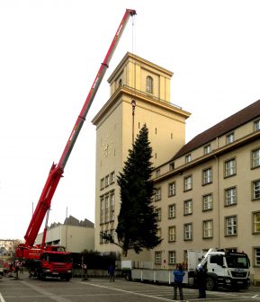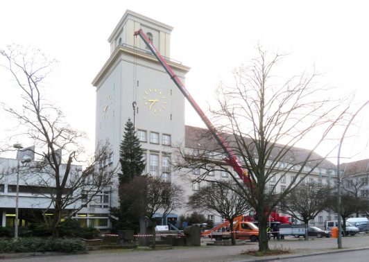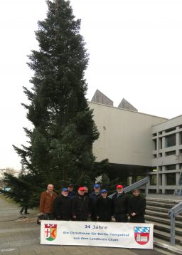Gestiftet wurde in diesem Jahr der Baum von der Gemeinde Arrach im Lamer Winkel. Es ist ein 40 Jahre alter prächtiger Tannenbaum vom Feriendorf „Am Hohenbogen“ mit einer Länge von 18 Meter. Den Transport hat, wie schon in den Jahren zuvor, die Baustofffirma Max Schierer aus Cham kostenfrei übernommen. Am 1. Dezember 2017 traf der Schwertransport nach einer 6-einhalb-stündigen Fahrt gegen 8:00 Uhr morgens am Rathaus-Vorplatz ein. Geplant war die offizielle Übergabe des Christbaumes dann durch MdB Karl Holmeier, Bundestagsabgeordneter der Landkreise Cham und Schwandorf, an die Bezirksbürgermeisterin von Tempelhof-Schöneberg, Angelika Schöttler. Wegen kurzfristiger Terminprobleme konnten beide leider nicht anwesend sein. Somit erfolgte die Übergabe von den beiden Mitarbeitern der Schierer GmbH, Reinhard Speckner und Walter Wütz. Mit herzlichen Grüßen von MdB Karl Holmeier, dem Landrat und Bezirkstagspräsident Franz Löffler, dem Bürgermeister der Gemeinde Arrach, Sepp Schmid, dem Leiter der Touristinfo Arrach, Stephan Frisch, dem Gemeinderat Johannes Altmann, dem Chef des örtlichen Bauhofs Stefan Hutter, sowie dem Seniorchef der Firma Schierer, Max Schierer, übergaben sie, nach der routinemäßigen Aufstellung des Tannenbaumes, diesen an den Bezirksstadtrat Oliver Schworck und den Vertretern des Lichtenrader Volksparkvereins Wolfgang Spranger (1. Vorsitzender), Dieter Ganz und Manfred Könings. Herr Schworck bedankte sich im Namen der Bezirksbürgermeisterin recht herzlich für den 34. Christbaum aus dem Bayerischen Wald und wünscht sich diese Spendenaktion auch noch für viele weitere Jahre. Es ist der einzige von drei Weihnachtsbäumen im Bezirk Tempelhof-Schöneberg, der uns nichts kostet, so Herr Schworck.