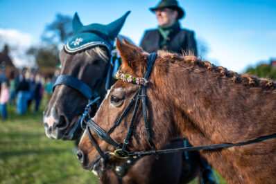 Auch die vielen glänzenden, mit Blumen geschmückten Kutschen, die bei diesem Anlass mitgeführt werden, tragen zur festlichen Atmosphäre bei. Der Kirchplatz ist festlich geschmückt, und die Menschen drängen sich entlang der Straßen, um diesen farbenprächtigen Umritt zu erleben. Der Pfarrer Christoph Rudolph segnet Ross und Reiter.