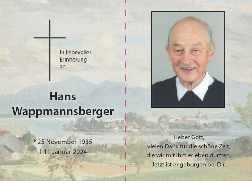 Hans Wappmannsberger kam 1935 in München am Namenstag der Heiligen Katharina, der Priener Schutzpatronin zur Welt, ging dort zur Schule und kam aber dann wegen der vielen Luftangriffe nach Prien zu Oma und Tanten. In Prien fand er viele Freunde, mit denen er sein Leben lang in Freundschaft verbunden blieb. Sein beruflicher Weg führte wieder nach München, dort fand er eine Wohnung während seiner Lehrzeit für die Ausbildung zum Einzelhandels-Verkäufer bei den Salesianern und in der Kolpingfamilie. In seinem Beruf war Hans Wappmannsberger unter anderem bei den Firmen Hipp und Dallmayr in Lohn und Brot. 1964 gründete er mit seiner Frau Helga eine Familie. Viel Freude hatten er und seine Frau mit vier Söhnen und Schwiegertöchtern sowie mit den Enkel- und Urenkel- Kindern. In der Priener Pfarrgemeinde wirkte Hans Wappmannsberger aktiv mit. So war er als Kind Ministrant, später stellte er sich als Mitglied des Pfarrgemeinderates, als Sammler, als Kommunion-Austeiler und für Krankenbesuche zur Verfügung.