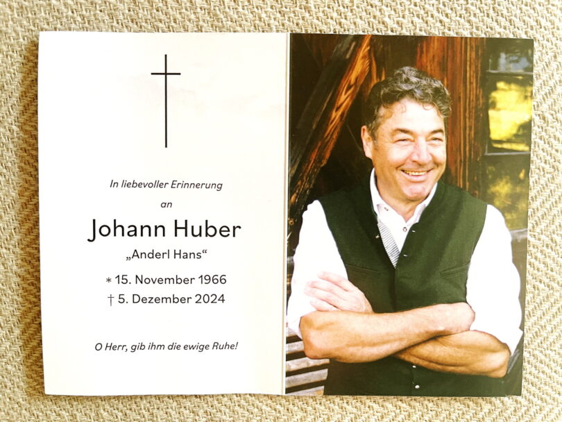 „Der Hans war weit mehr als der Inhaber der Anderlbauer Käsespezialitäten, er war ein Visionär, ein leidenschaftlicher Landwirt und ein gestandener Mann, der als gelernter Zimmerer mit seiner Heimat und mit der Natur auf das Engste verbunden war“ – so zu Beginn des in der Kirche verlesenen Nachrufes seiner Angehörigen. Johann Huber war das älteste von vier Geschwistern, er wuchs auf dem elterlichen Bauernhof auf, leistete nach der Lehre seinen Bundeswehrdienst und hatte bis zuletzt anhaltende Freundschaften aus dieser Zeit. In der anschließenden Winterschule lernte er seine Frau Margarita kennen, der Hochzeit im Jahr 1995 und der Ehe entstammten drei Kinder und es begann sein wichtigstes berufliches Projekt, dazu hieß es: „Im Millikammerl unter der Tennenbrücke schuf er von der Milch der eigenen Schafe seinen ersten Schafskäse, aufgrund seinem stetigen Streben und Suchen nach Besserem wurde das Unternehmen zu einem Erfolgsprojekt über die Gemeinde- und Chiemgau-Grenzen hinaus“. Der Anderlbauer war bekannt als zuvorkommender Mensch, als großzügiger Gastgeber und als ein Mensch mit viel Witz und Humor, in diesem Sinne wurde er gerne von den Kindern als „Schwindler-Hans“ bezeichnet. Er hatte mit seinen Wertevorstellungen klare Ziele, stellte manche Bürokratie in Frage und er war trotz seiner Bestimmtheit ein fürsorgender Mensch, dessen Lebenswerk die Käserei wurde. Dabei unterstützte und schützte er den Bio-Fachverband, die Direktvermarktung und auch die Regionalwährung. „Viele von ihm selbst geschaffenen Baustellen hinterlassen ein großes und leeres Warum, was bleibt sind sein Lebenswerk sowie die Erinnerung an sein Lachen und an seine Geschichten, seine Spuren machen ihn unvergesslich“ – so abschließend im Nachruf seiner Angehörigen.