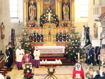 Pfarrer Gottfried Grengel erinnerte in seiner Predigt an das Johannes-Evangelium und tröstete mit den Worten: „Das Leben ist stärker als die Finsternis. Das Licht des Lebens besteht aus Verzeihen und aus den göttlichen Eigenschaften Glaube, Liebe und Hoffnung. Mit unserem Glauben gewinnen wir das Licht auch in dunkler Nacht“. Die musikalische Gestaltung der Trauerfeierlichkeiten erfolgten durch Chorgesang, Orgelbegleitung und Musikanten aus den Reihen der Trauerfamilie in der Kirche sowie durch Bläserweisen auf dem Friedhof durch Peter Aicher und Peter Fischer. Am offenen Grab senkten sich die Fahnen der Ortsvereine (Trachtenverein, Feuerwehr, Schützenverein und Veteranenverein) zum letzten Gruß. Dabei wurde mit einem gemeinsamen Vaterunser auch daran erinnert, dass Johann Huber als Fähnrich der Thomasschützen von 1992 bis 2005 mit den Ortsvereinen aktiv und freundschaftlich verbunden war.